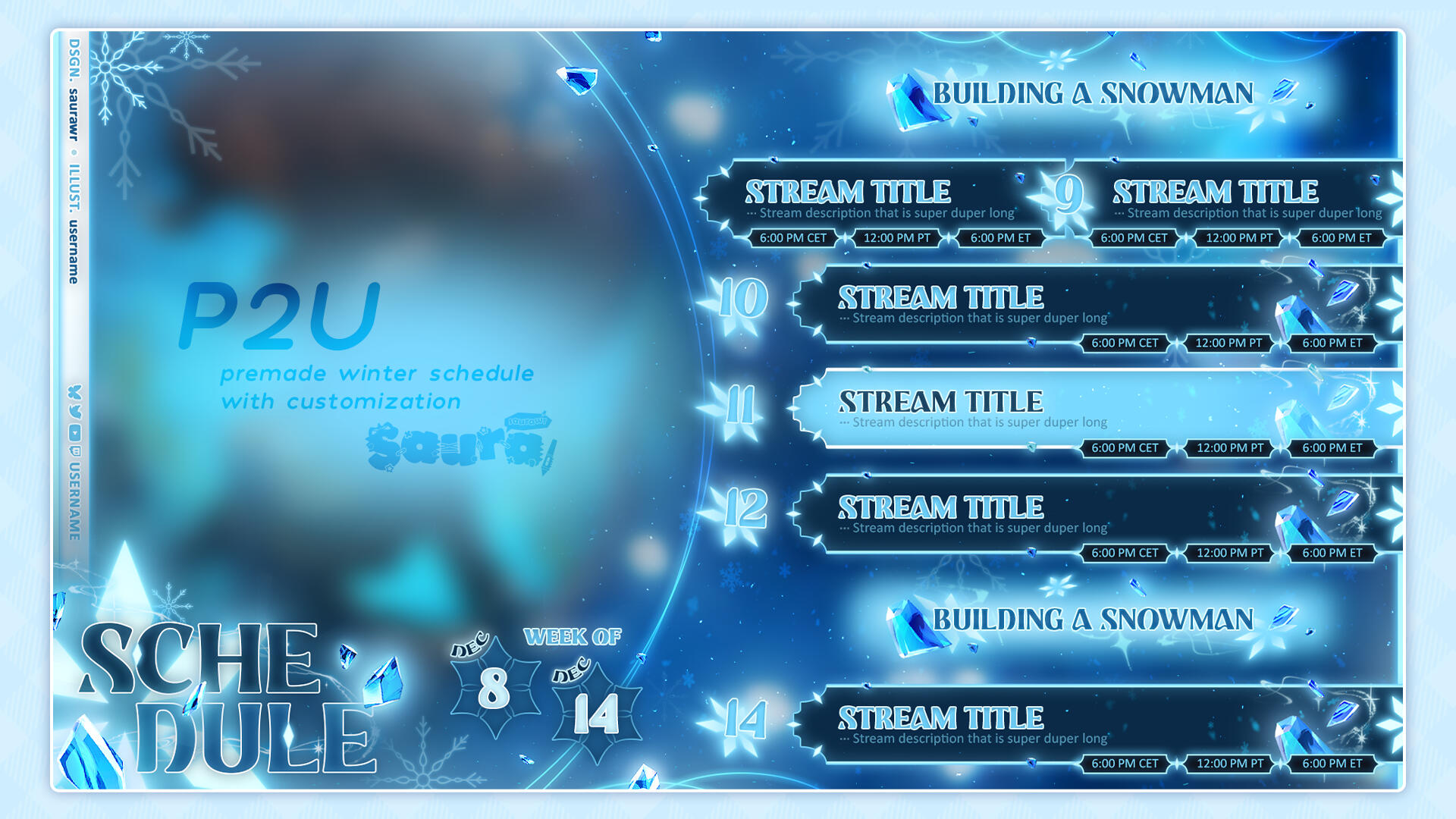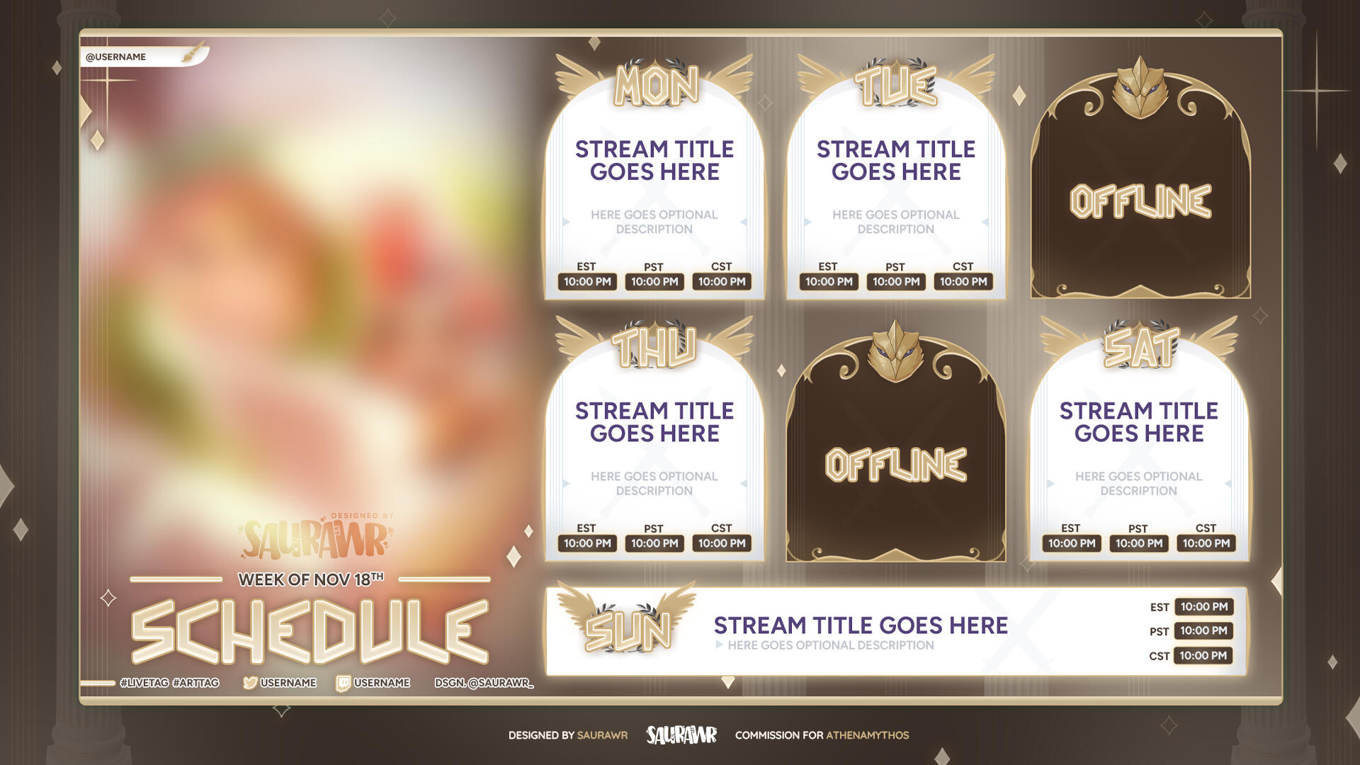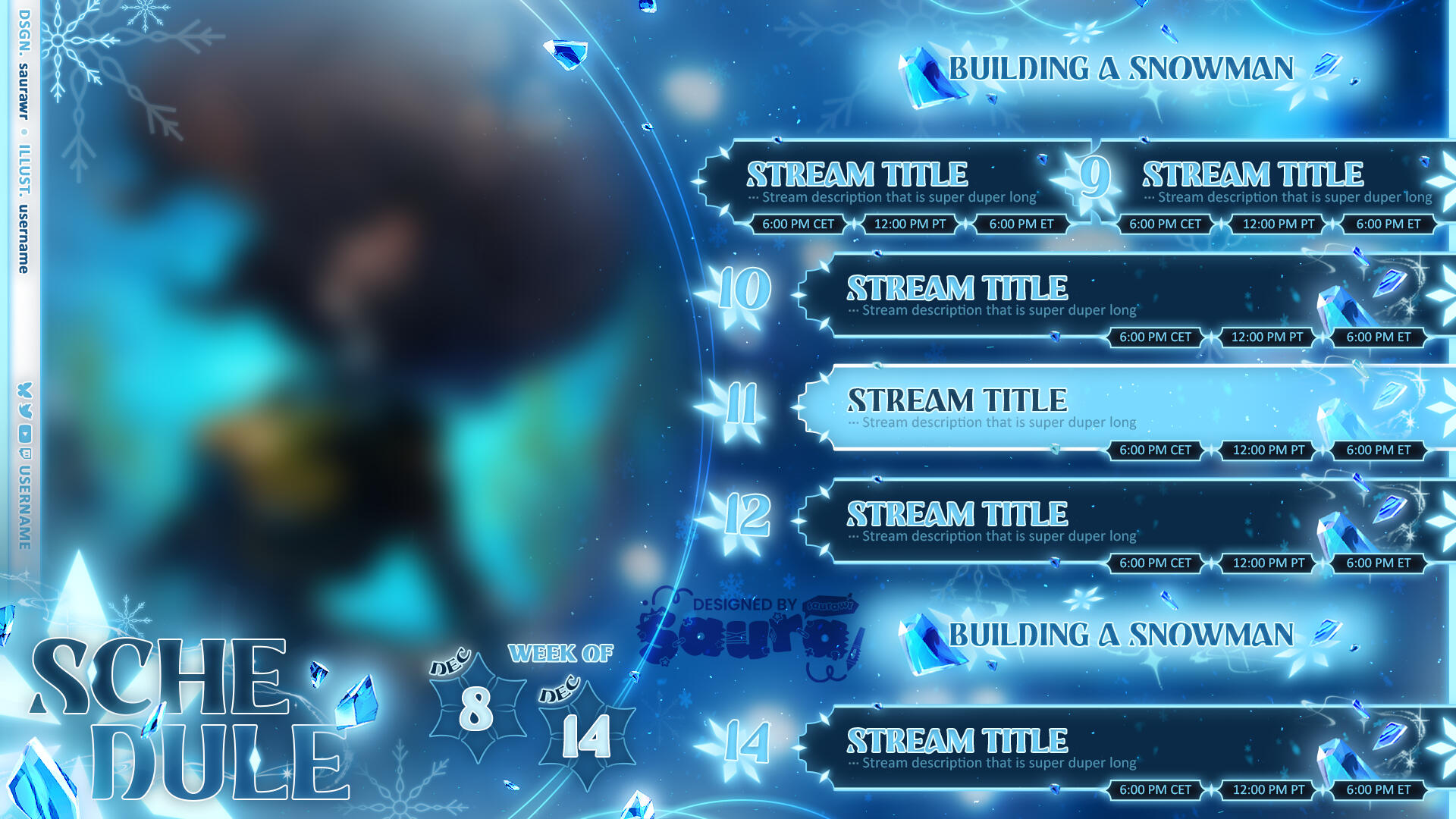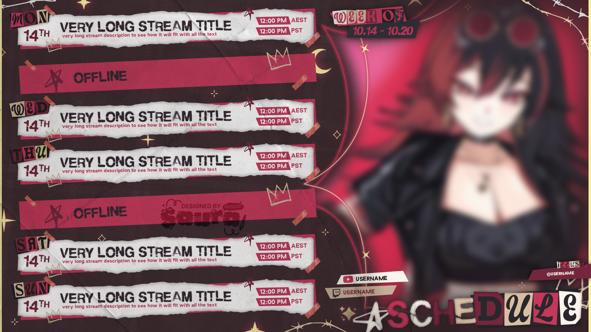 Saura is very reliable and she gave me regular updates. She immediately met my taste with the overlays and the weekly schedule based on my modboard. The logo took a while to find the right one for me, but she was very patient and responded to all my wishes. The support afterwards is also very commendable. I would commission her again at any time!