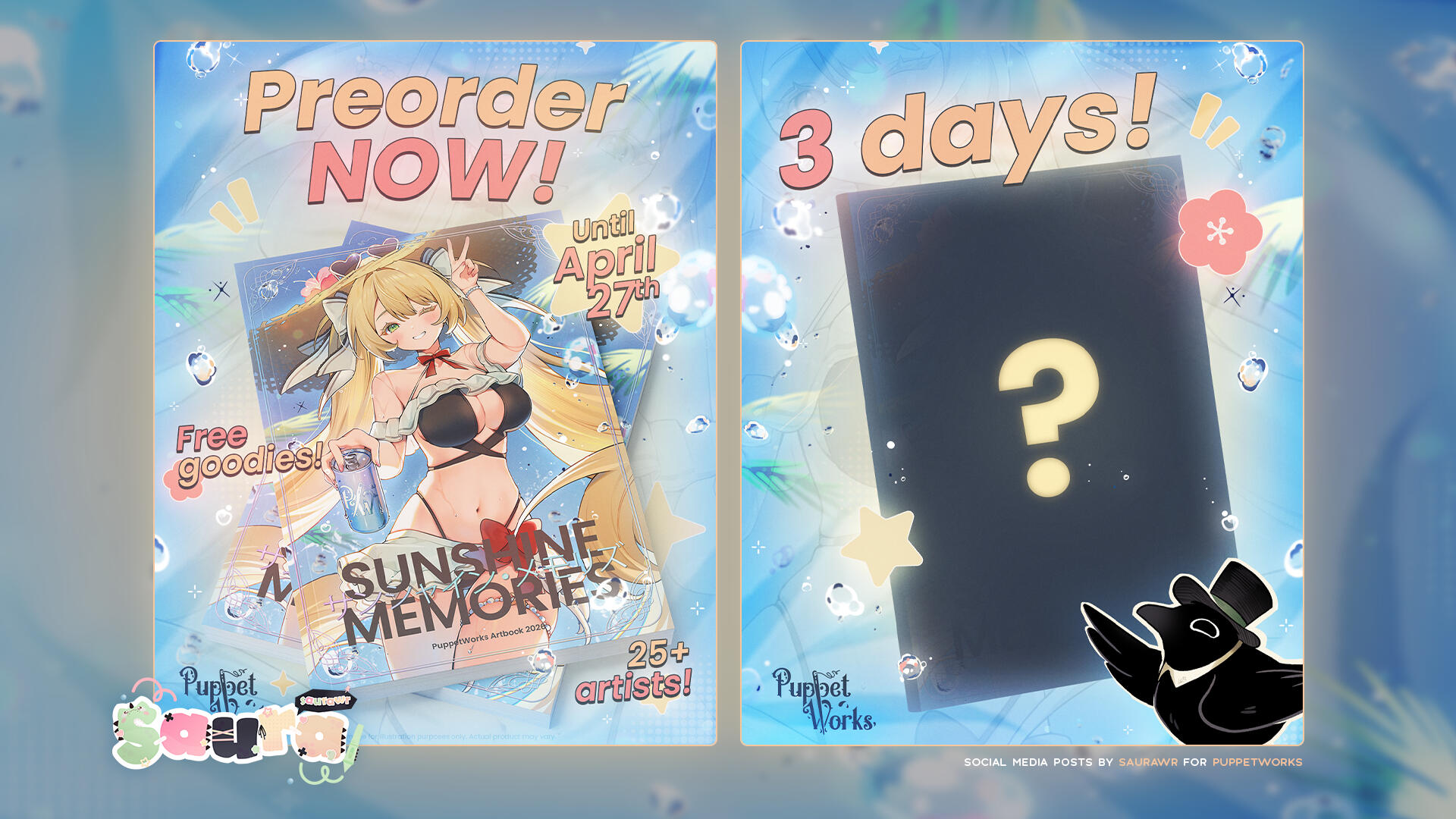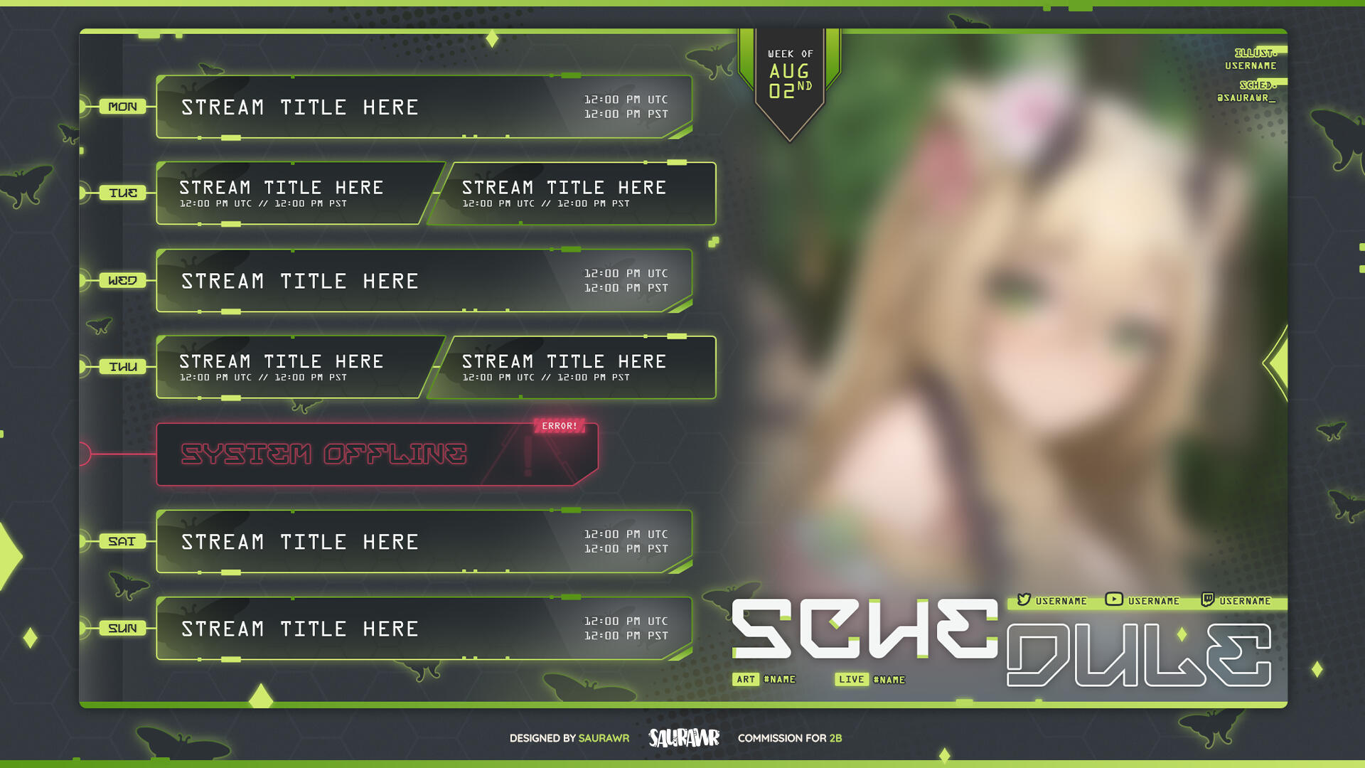 Clear and visible credit to my Twitter account (@saurawr_) must be provided on any social media platforms where the commissioned work is used.